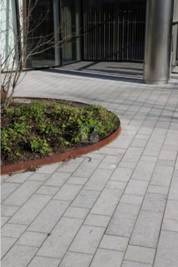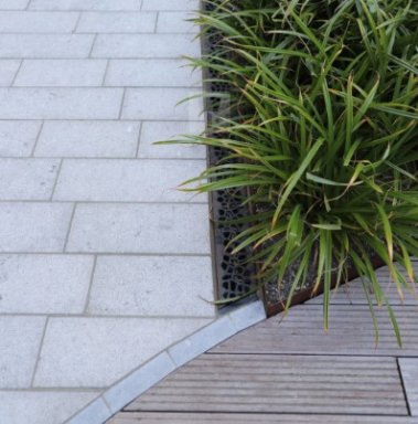 De ijsbloemen tegels in Belgische blauwe hardsteen hebben een levendige uitstraling. Hun oppervlak – met een onregelmatige vormgeving van lichte dunne lijnen op de middengrijze ondergrond van de gebarsten steen - doet denken aan vorstkristallen.